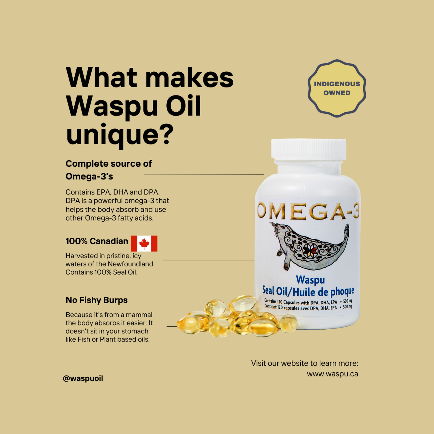 made in Canada. Waspu (Seal) Oil is an Indigenous-branded natural health product, rendered from the blubber of seals, humanely and sustainably harvested from the icy waters of Canada’s North Atlantic. Consuming seal oil o ers a vast and diverse range of health benefits to improve the quality of life for people of all ages. Waspu Oil brings the goodness of the ocean to you.